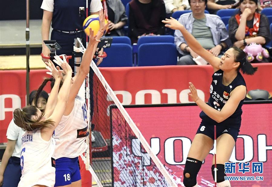 9月16日,中国队球员龚翔宇(右)在比赛中扣球。 当日,在日本横滨举行的2019年女排世界杯赛第一阶段A组循环赛比赛中,中国队以3比0战胜俄罗斯队。 新华社记者贺灿铃摄