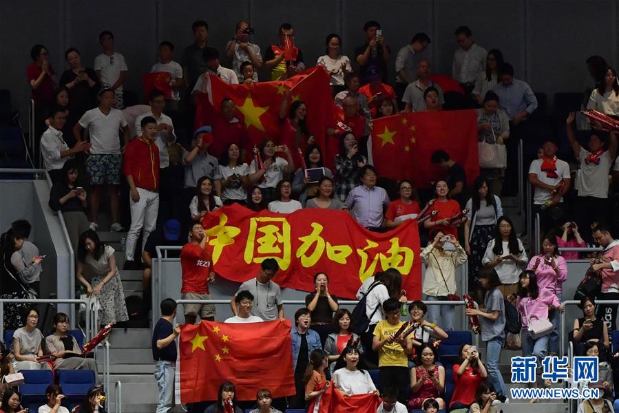 9月19日,中国队球迷为球队呐喊助威。 当日,在日本横滨举行的2019年女排世界杯赛第一阶段A组循环赛比赛中,中国队以3比0战胜日本队。 新华社记者朱炜摄