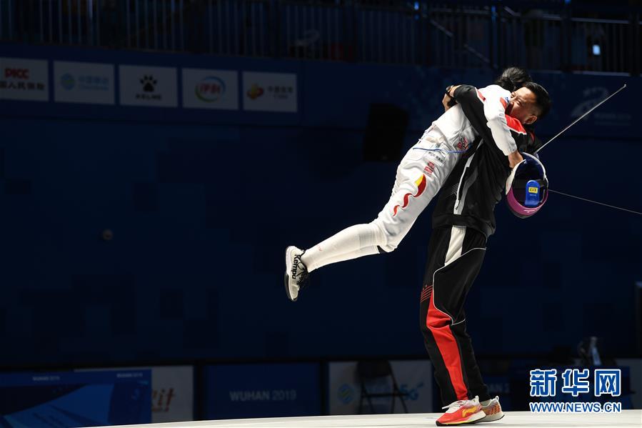 10月19日,中国选手孙一文(左)在比赛结束与教练拥抱庆祝。当日,在武汉举行的第七届世界军人运动会女子重剑个人赛决赛中,中国选手孙一文以11比10战胜罗马尼亚选手安娜,获得冠军。 新华社记者 王鹏 摄