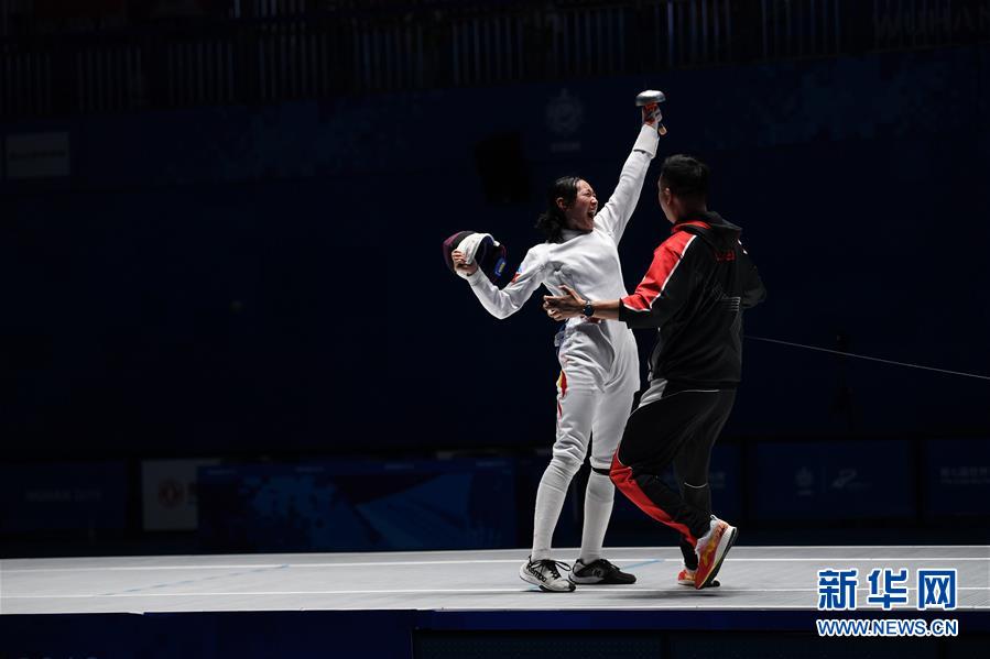 10月19日,中国选手孙一文(左)获胜后与教练庆祝。当日,在武汉举行的第七届世界军人运动会女子重剑个人赛决赛中,中国选手孙一文以11比10战胜罗马尼亚选手安娜,获得冠军。 新华社记者 王建威 摄