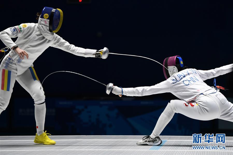 10月19日,中国选手孙一文(右)在比赛中。当日,在武汉举行的第七届世界军人运动会女子重剑个人赛决赛中,中国选手孙一文以11比10战胜罗马尼亚选手安娜,获得冠军。 新华社记者 王建威 摄