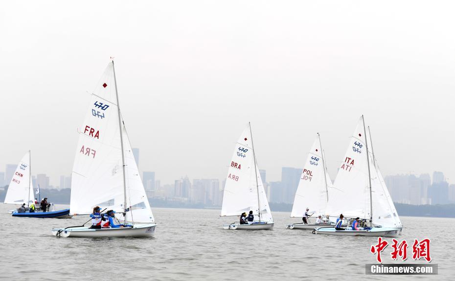 10月22日,第七届世界军人运动会帆船项目在武汉市圆满收官。经过最后3轮的激烈角逐,巴西队获得男女混合470级比赛冠军,波兰队获得女子470级冠军。图为女子470级比赛现场。中新社记者 安源 摄