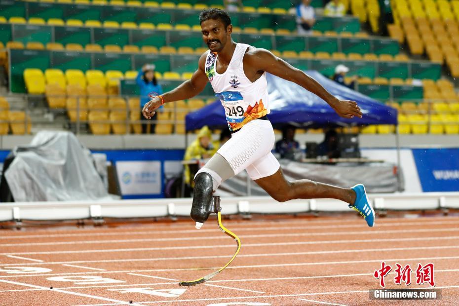 10月22日,第七届世界军人运动会田径比赛在武汉五环体育中心举行。在男子残疾人400米IT1级决赛中,印度选手GUNASEKARAN ANANDAN以53妙35夺冠。中新社记者 富田 摄
