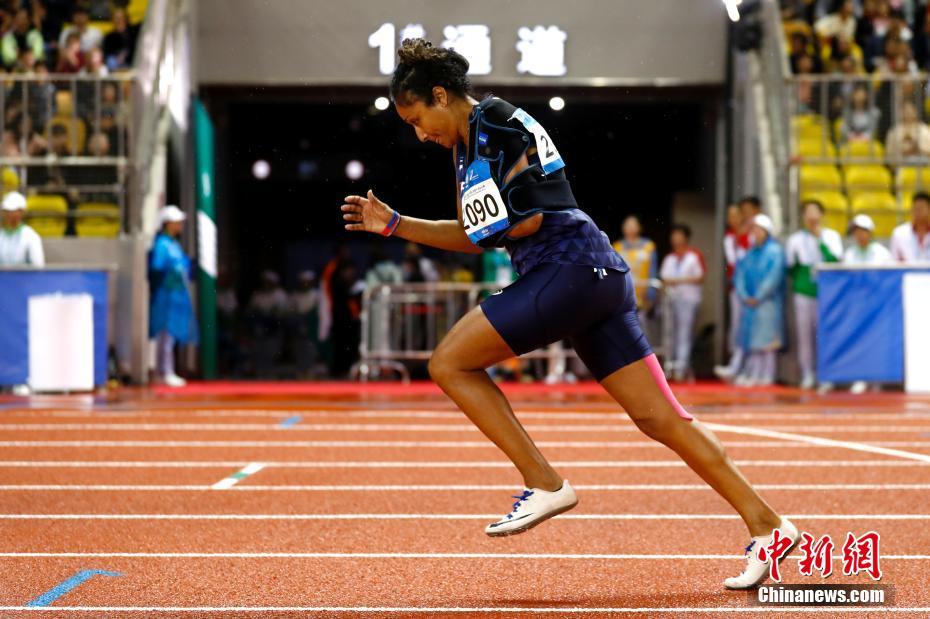 10月22日,第七届世界军人运动会田径比赛在武汉五环体育中心举行。在女子残疾人400米IT3级决赛中,法国选手SABRINA DAULAUS以1分12秒74夺冠。中新社记者 富田 摄