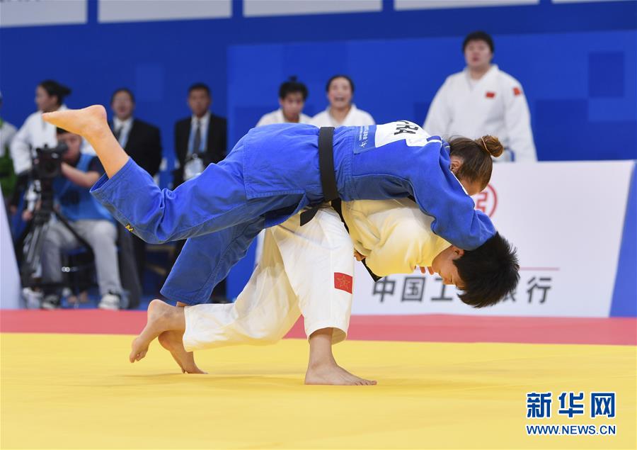 10月22日,中国队选手唐婧(下)和法国队选手伊万在比赛中。 当日,在武汉进行的第七届世界军人运动会柔道项目女子团体赛中,中国队以3比0战胜法国队,获得冠军。 新华社记者胡虎虎摄