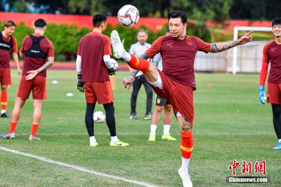 11月3日,广州天河体育中心,中国国家男子足球队球员张琳芃为训练热身。当日,为备战2022年卡塔尔世界杯亚洲区预选赛预赛阶段(四十强赛)的比赛,中国国家男子足球队在广州进行集训。中新社记者 陈骥旻 摄