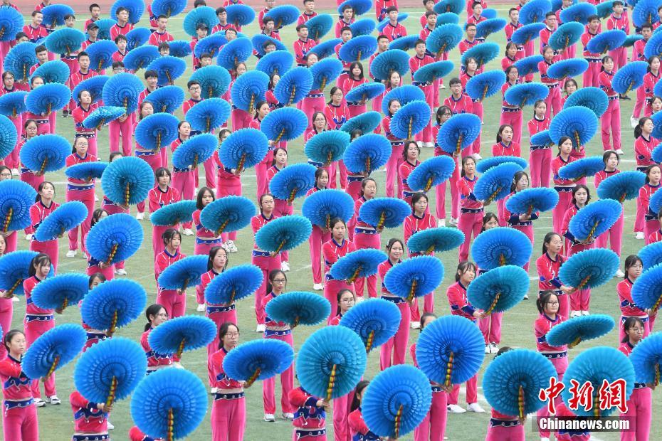11月11日,重庆石柱民族体育运动会开幕式上,学生集中展示土家摆手舞、抢天地球、民族团体操、太极等,场面显得特别壮观。当日,重庆石柱第三届“风情土家·康养石柱”民族体育运动会在当地体育中心正式举行。据悉,运动会设有集体项目和个人项目。集体项目有趣味接力、拔河、滚铁环、乒乓球、羽毛球等。个人项目有5000米赛跑、跳绳、踢毽、网球、台球、游泳、钓鱼、象棋、扭扁担等。陈超 摄