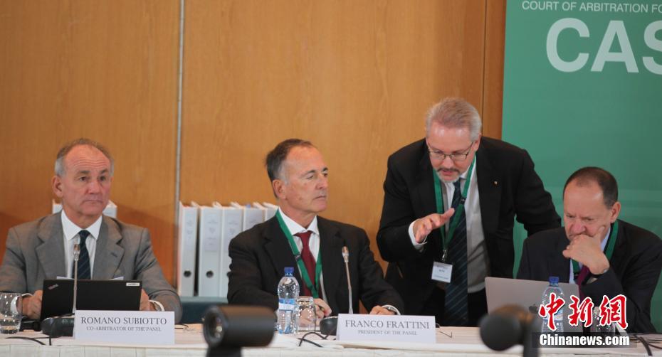 当地时间11月15日,国际体育仲裁法庭(CAS)在瑞士蒙特勒就世界反兴奋剂机构(WADA)诉孙杨和国际泳联案举行公开听证会,孙杨及其律师团队到庭应诉。这是国际体育仲裁法庭20年来第二次就运动员诉案举行公开听证会。图为法庭仲裁小组三名成员(前排就坐者)。中新社记者 德永健 摄