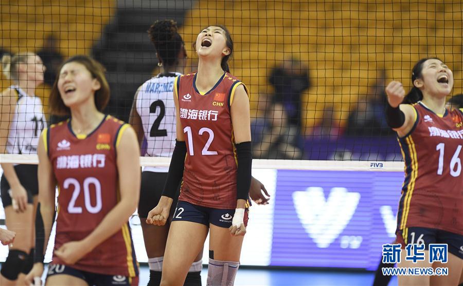 12月5日,天津渤海银行队球员袁心玥(中)与队友庆祝胜利。 当日,在浙江绍兴进行的2019世界女子排球俱乐部锦标赛B组第二轮比赛中,中国天津渤海银行队以3比2战胜巴西海滩队。 新华社记者李俊东摄