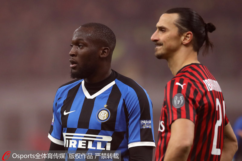 2020年2月10日,2019-2020赛季意甲联赛第23轮,国际米兰4:2胜AC米兰,国米队员球衣肩膀上印有“中国加油”。图为国米球员卢卡库(左)