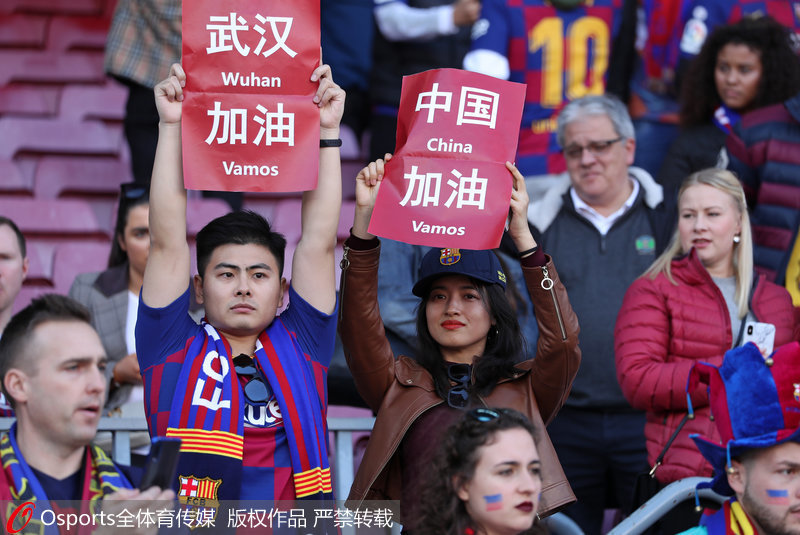 2020年2月16日,2019-2020赛季西甲联赛第24轮,巴塞罗那2:1胜赫塔菲,球迷打出标语“武汉加油 中国加油”