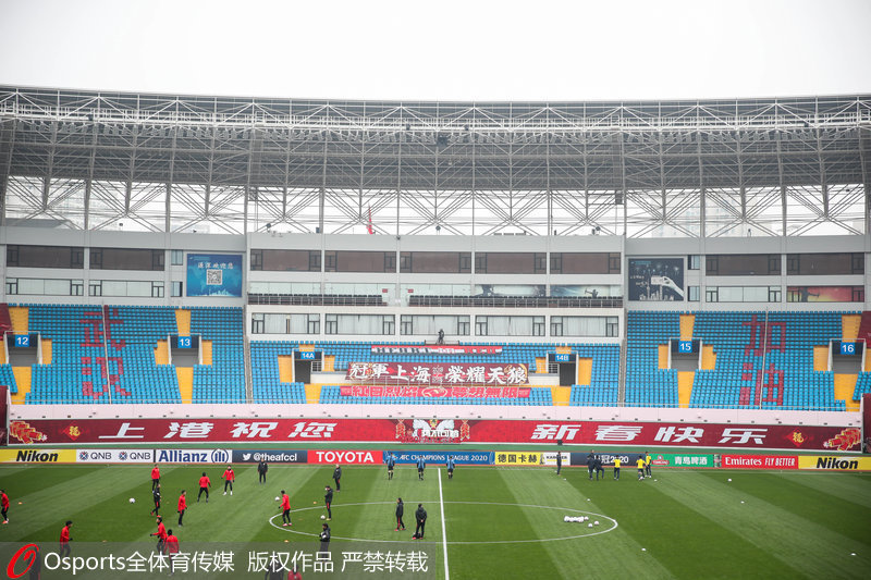2020年1月28日,2020年亚冠联赛附加赛,上海上港vs武里南联,源深体育中心空场,摆放“武汉加油”字样,为武汉同胞加油鼓劲。