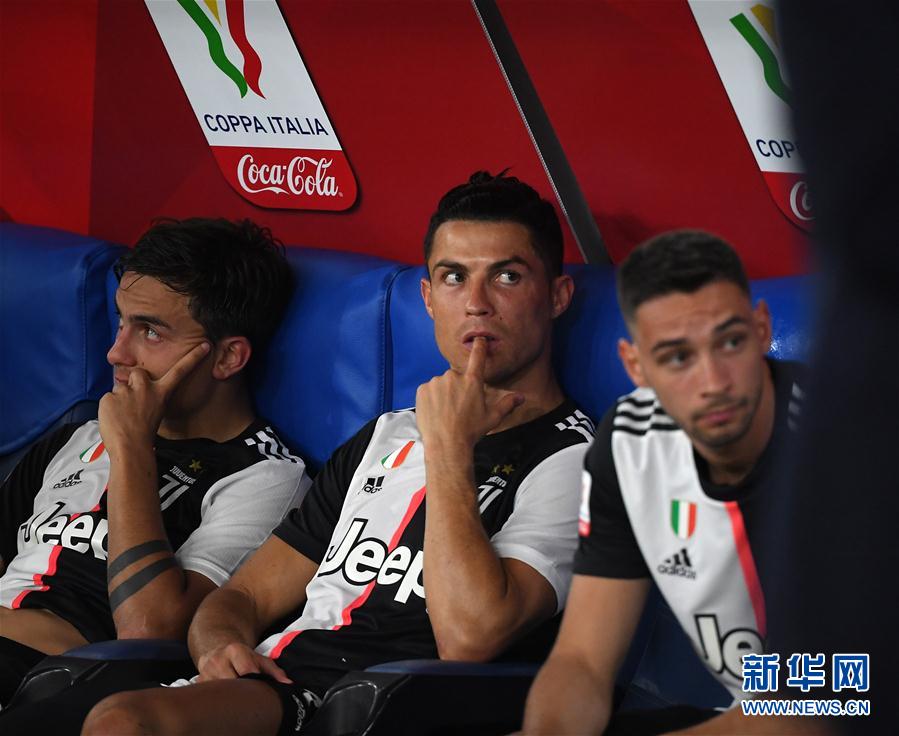 6月17日,尤文图斯队球员克·罗纳尔多(中)在场边观战。 当日,在意大利罗马举行的2019-2020赛季意大利杯决赛中,那不勒斯队与尤文图斯队在90分钟内战成0比0平,经过点球大战,那不勒斯队以4比2获胜,夺得冠军。 新华社发(奥古斯托·卡萨索利摄)