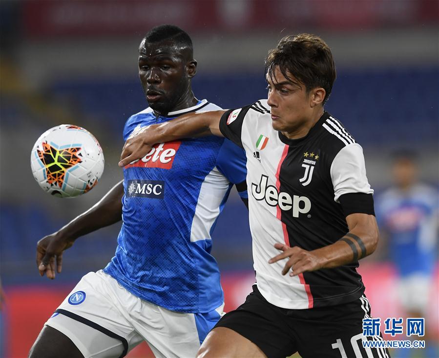 6月17日,那不勒斯队球员库利巴利(左)在比赛中和尤文图斯队球员迪巴拉拼抢。 当日,在意大利罗马举行的2019-2020赛季意大利杯决赛中,那不勒斯队与尤文图斯队在90分钟内战成0比0平,经过点球大战,那不勒斯队以4比2获胜,夺得冠军。 新华社发(奥古斯托·卡萨索利摄)