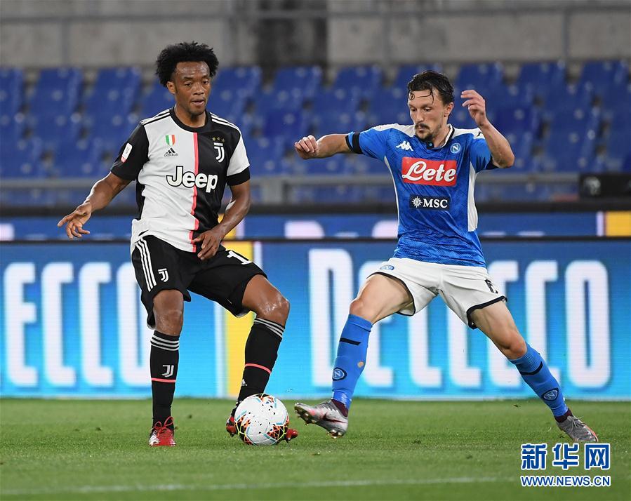 6月17日,那不勒斯队球员马里奥·鲁伊(右)在比赛中和尤文图斯队球员夸德拉多拼抢。 当日,在意大利罗马举行的2019-2020赛季意大利杯决赛中,那不勒斯队与尤文图斯队在90分钟内战成0比0平,经过点球大战,那不勒斯队以4比2获胜,夺得冠军。 新华社发(奥古斯托·卡萨索利摄)