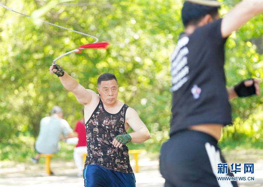 在长春市南湖公园,市民通过甩健身鞭、抖空竹等多种方式锻炼身体,保持健康的身心状态。随着长春市“拆围透绿”“补植增绿”工程的实施推进,城市里的公园为市民提供了更多的健身空间。 图为6月17日,市民在长春市南湖公园内甩健身鞭锻炼身体。 新华社发(颜麟蕴摄)