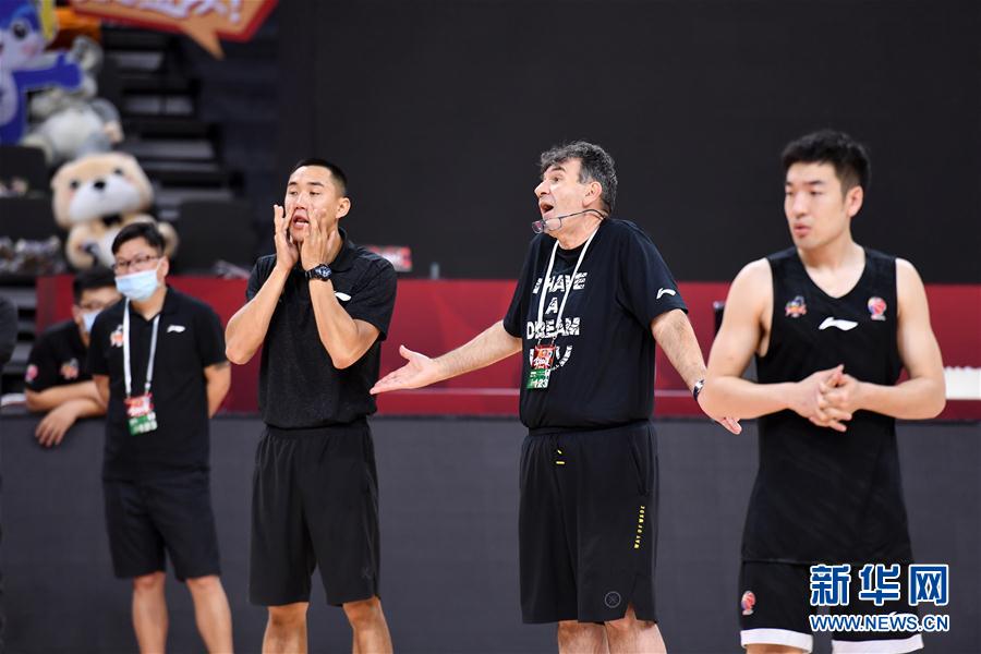6月19日,江苏苏州肯帝亚队主教练梅米·贝西诺维奇(右二)在指导球员。 当日,江苏、山西等多支球队在广东东莞银行篮球中心进行了赛前训练。2019-2020赛季中国男子篮球职业联赛(CBA)将于6月20日复赛,将以赛会制空场比赛的方式在青岛与东莞两个赛区展开。 新华社记者 梁旭 摄