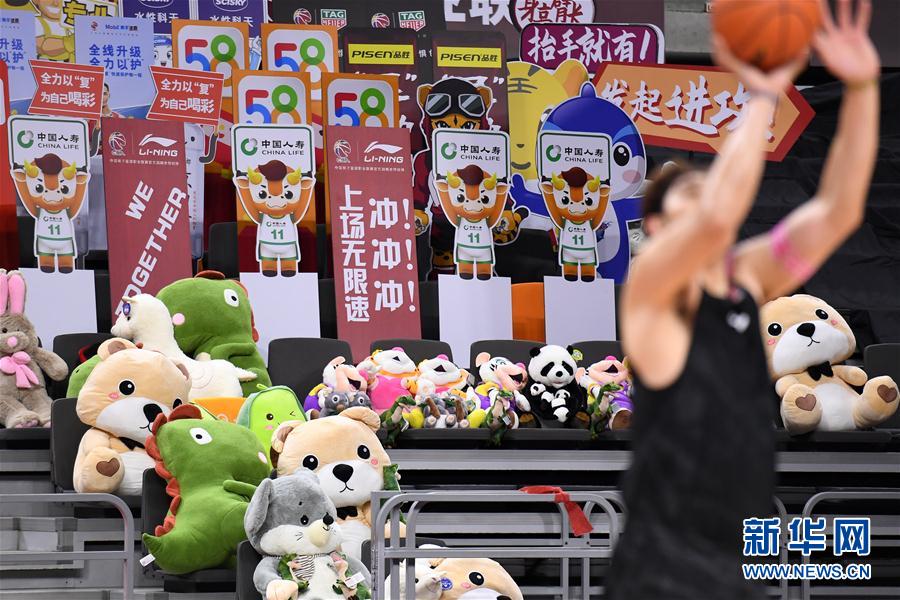 6月19日,场边的玩偶“观众”在“观看”江苏苏州肯帝亚队的训练。 当日,江苏、山西等多支球队在广东东莞银行篮球中心进行了赛前训练。2019-2020赛季中国男子篮球职业联赛(CBA)将于6月20日复赛,将以赛会制空场比赛的方式在青岛与东莞两个赛区展开。 新华社记者 梁旭 摄