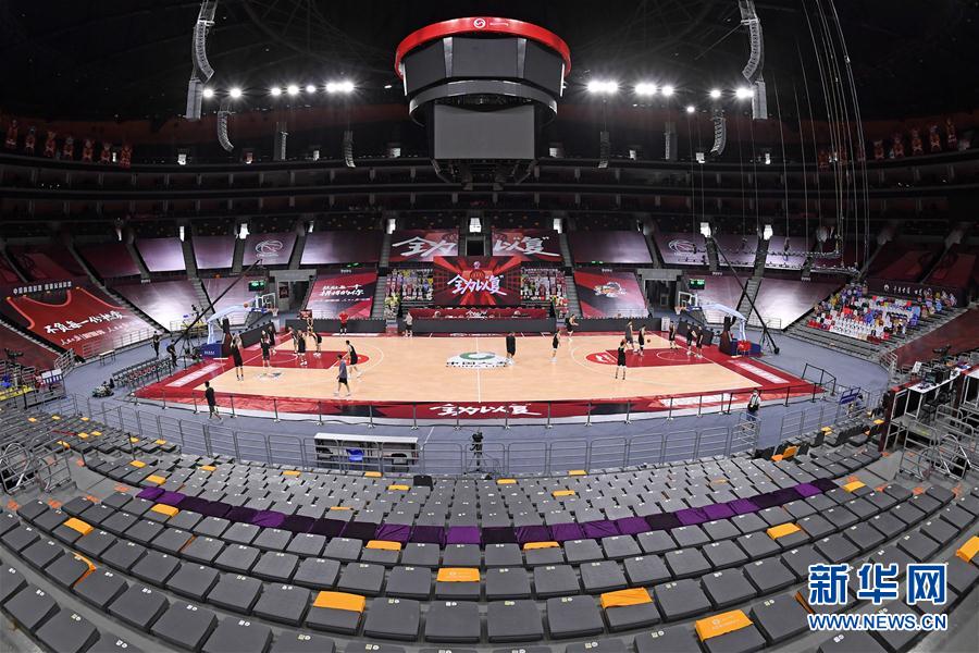 6月19日,山西汾酒股份队球员进行赛前训练。 当日,江苏、山西等多支球队在广东东莞银行篮球中心进行了赛前训练。2019-2020赛季中国男子篮球职业联赛(CBA)将于6月20日复赛,将以赛会制空场比赛的方式在青岛与东莞两个赛区展开。 新华社记者 梁旭 摄