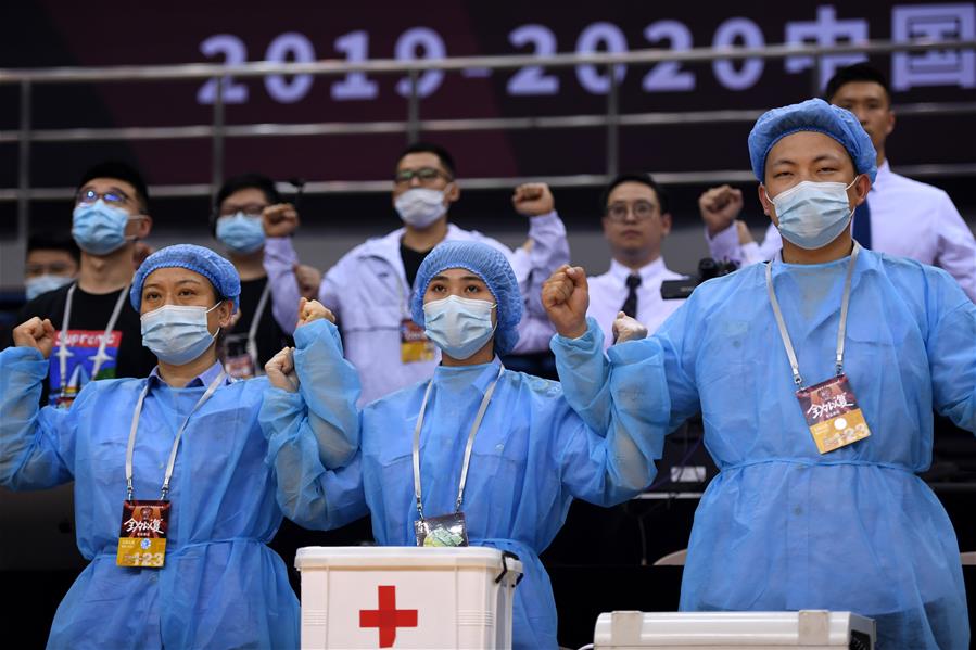 6月20日,现场工作人员在“致敬抗疫英雄”纪念仪式上。 当日,2019-2020赛季中国男子篮球职业联赛(CBA)复赛第一阶段青岛赛区比赛拉开战幕。在青岛国信体育馆举行的首场比赛前,中国篮协举行了“致敬抗疫英雄”纪念、默哀仪式。 新华社记者 李紫恒 摄