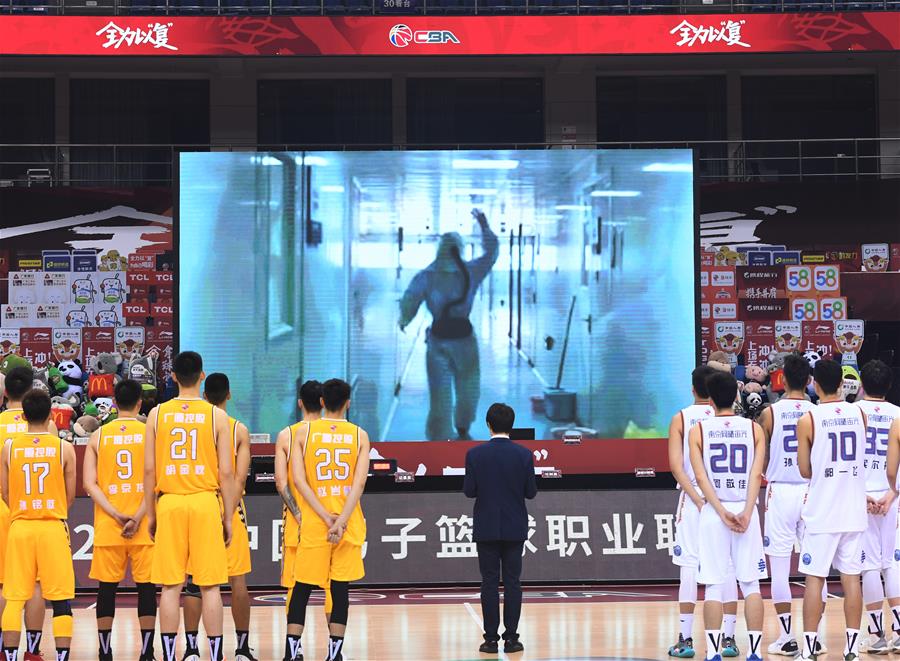 6月20日,双方球员在“致敬抗疫英雄”纪念仪式上。 当日,2019-2020赛季中国男子篮球职业联赛(CBA)复赛第一阶段青岛赛区比赛拉开战幕。在青岛国信体育馆举行的首场比赛前,中国篮协举行了“致敬抗疫英雄”纪念、默哀仪式。 新华社记者 李紫恒 摄
