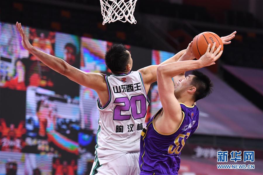6月23日,山东西王队球员陶汉林(左)在比赛中防守北京控股队球员孙桐林。 当日,在广东东莞进行的2019-2020赛季中国男子篮球职业联赛(CBA)复赛第一阶段比赛中,北京控股队以103比94战胜山东西王队。 新华社记者 梁旭 摄