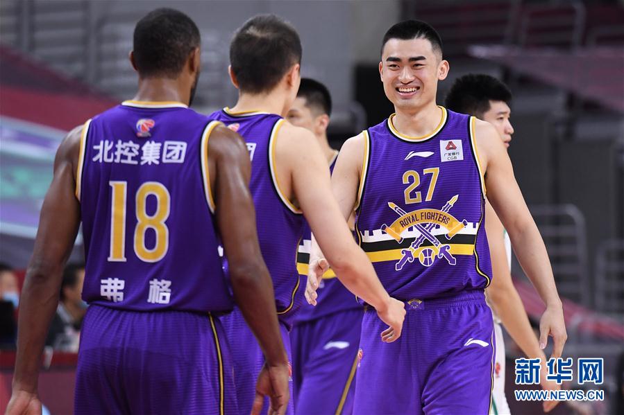 6月23日,北京控股队球员高尚(右)在获胜后与队友庆祝。 当日,在广东东莞进行的2019-2020赛季中国男子篮球职业联赛(CBA)复赛第一阶段比赛中,北京控股队以103比94战胜山东西王队。 新华社记者 梁旭 摄