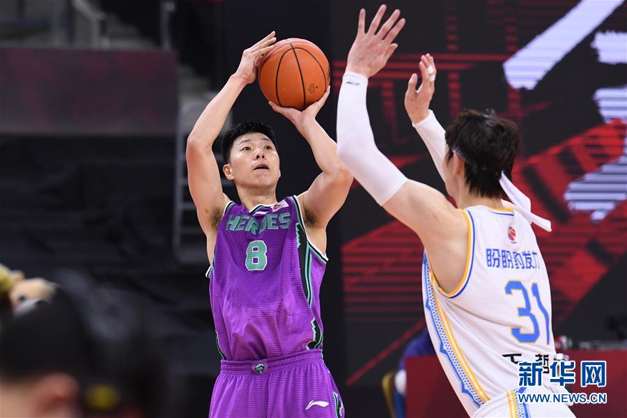 6月25日,山东西王队球员李敬宇(左)在比赛中投篮。 当日,在广东东莞举行的2019-2020赛季中国男子篮球职业联赛(CBA)复赛第一阶段比赛中,山东西王队以84比93不敌福建豹发力队。 新华社记者 梁旭 摄