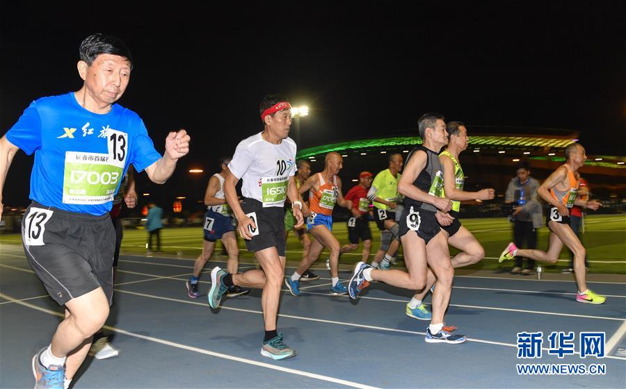 6月26日,在长春市体育运动学校田径场,65周岁及以上男子组的参赛选手在比赛中出发。 当日,长春市首届荧光夜跑节在长春市体育运动学校田径场举行,百余名跑步爱好者参与其中,在夏夜中奔行,享受运动健身的快乐。 新华社记者许畅摄