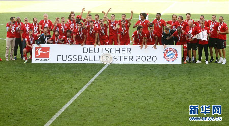 6月27日,拜仁慕尼黑队球员在颁奖仪式上。 当日,在2019-2020赛季德国足球甲级联赛第34轮比赛中,拜仁慕尼黑队客场以4比0战胜沃尔夫斯堡队,以积分82分夺得联赛冠军。 新华社/路透