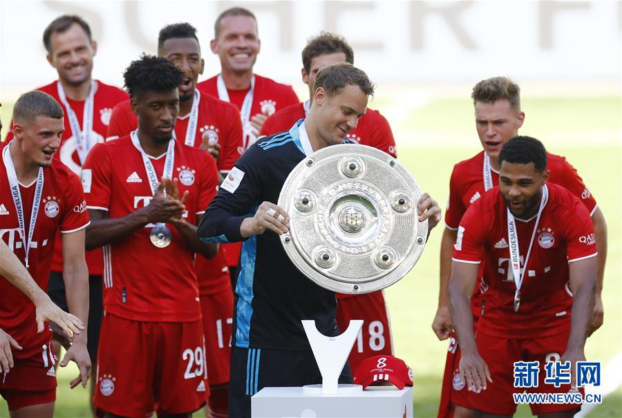 6月27日,拜仁慕尼黑队球员诺伊尔(中)在颁奖仪式上准备举起奖盘。 当日,在2019-2020赛季德国足球甲级联赛第34轮比赛中,拜仁慕尼黑队客场以4比0战胜沃尔夫斯堡队,以积分82分夺得联赛冠军。 新华社/路透