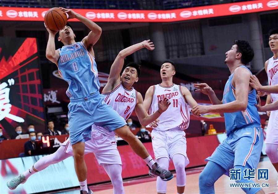 6月27日,新疆伊力特队球员唐才育(左一)在比赛中上篮。 当日,在山东青岛举行的2019-2020赛季中国男子篮球职业联赛(CBA)复赛第一阶段比赛中,新疆伊力特队以102比82战胜青岛国信双星队。 新华社记者李紫恒摄