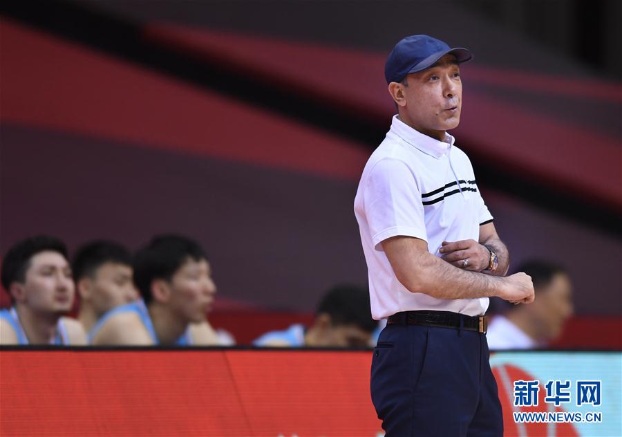 6月27日,新疆伊力特队主教练阿的江在场边指导。 当日,在山东青岛举行的2019-2020赛季中国男子篮球职业联赛(CBA)复赛第一阶段比赛中,新疆伊力特队以102比82战胜青岛国信双星队。 新华社记者李紫恒摄