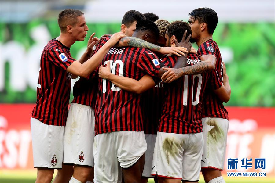 6月28日,AC米兰队球员在比赛中庆祝恰尔汗奥卢的进球。 当日,在2019-2020赛季意大利足球甲级联赛第28轮比赛中,AC米兰队主场以2比0战胜罗马队。 新华社发(达尼埃莱·马斯科洛摄)
