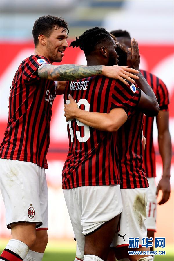 6月28日,AC米兰队球员在比赛中庆祝恰尔汗奥卢的进球。 当日,在2019-2020赛季意大利足球甲级联赛第28轮比赛中,AC米兰队主场以2比0战胜罗马队。 新华社发(达尼埃莱·马斯科洛摄)