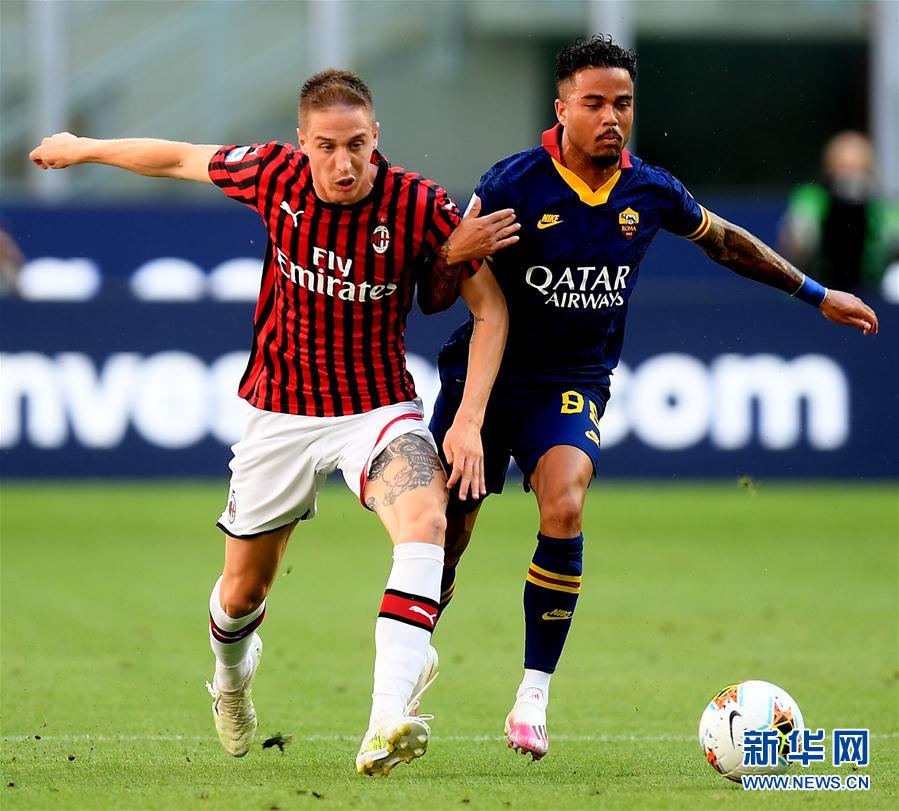 6月28日,AC米兰队球员安德烈亚·孔蒂(左)与罗马队球员尤斯廷·克鲁伊维特在比赛中拼抢。 当日,在2019-2020赛季意大利足球甲级联赛第28轮比赛中,AC米兰队主场以2比0战胜罗马队。 新华社发(达尼埃莱·马斯科洛摄)
