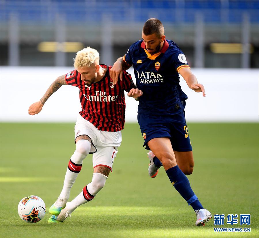 6月28日,AC米兰队球员卡斯蒂列霍(左)与罗马队球员斯皮纳佐拉在比赛中拼抢。 当日,在2019-2020赛季意大利足球甲级联赛第28轮比赛中,AC米兰队主场以2比0战胜罗马队。 新华社发(达尼埃莱·马斯科洛摄)