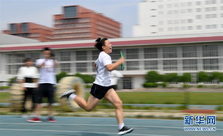6月29日,吉林省柔道队队员曲莹在女子100米接力比赛中。 当日,吉林省体育局举行夏季“体能大比武”,吉林省举重、摔跤、柔道三支运动队的100余名运动员参加了100米接力、翻轮胎等项目的测试,全力备战2021年全运会。 新华社记者林宏摄