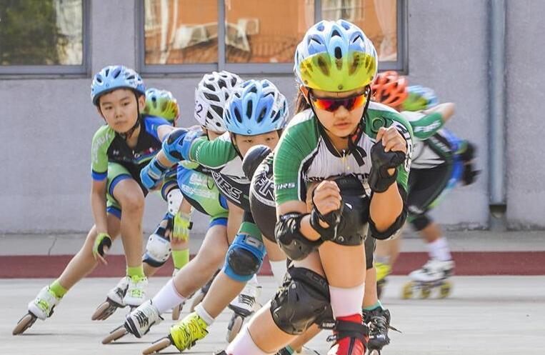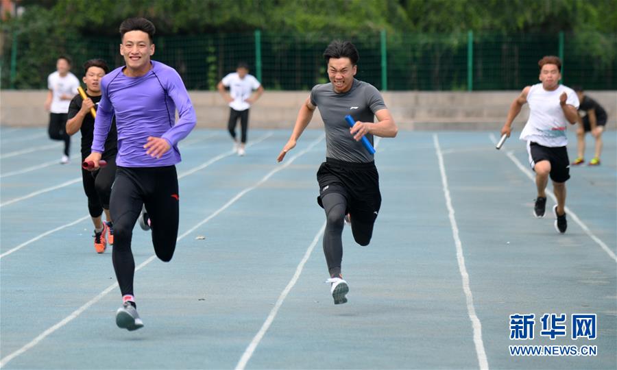 6月29日,吉林省摔跤队队员李佳龙(前左)和吉林省柔道队队员李田泽(前中)在男子100米接力比赛中。 当日,吉林省体育局举行夏季“体能大比武”,吉林省举重、摔跤、柔道三支运动队的100余名运动员参加了100米接力、翻轮胎等项目的测试,全力备战2021年全运会。 新华社记者林宏摄