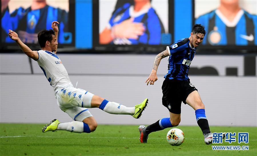 7月1日,国际米兰队球员巴斯托尼(右)在比赛中进攻。 当日,在2019-2020赛季意大利足球甲级联赛第29轮比赛中,国际米兰队主场以6比0战胜布雷西亚队。 新华社发
