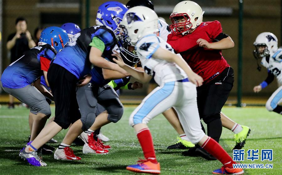 7月4日,音速队(左)和黑豹队球员在比赛中对阵。 当日,2020快乐橄榄球联赛首场比赛在上海举行,对阵双方是U11组的音速队和黑豹队,小球员们在球场上奋力拼搏,强健体魄的同时也增强了团队合作的意识。最终音速队以29比6战胜黑豹队。 新华社记者方喆摄