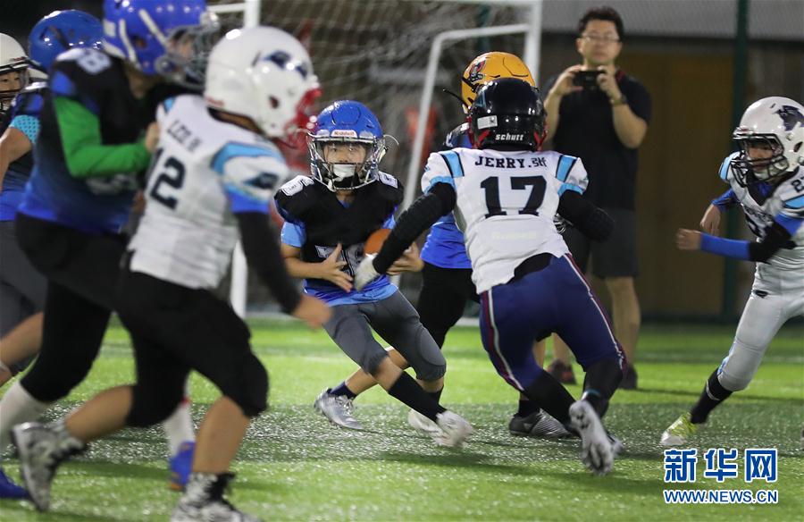 7月4日,音速队球员肖涞恩(中)在比赛中进攻。 当日,2020快乐橄榄球联赛首场比赛在上海举行,对阵双方是U11组的音速队和黑豹队,小球员们在球场上奋力拼搏,强健体魄的同时也增强了团队合作的意识。最终音速队以29比6战胜黑豹队。 新华社记者方喆摄