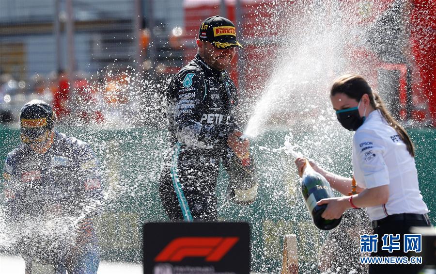 7月5日,梅赛德斯车队芬兰车手博塔斯(中)在颁奖仪式上喷洒香槟,庆祝夺冠。 当日,在奥地利红牛赛道举行的2020世界一级方程式锦标赛(F1)奥地利站正赛中,梅赛德斯车队芬兰车手博塔斯夺冠。 新华社/路透