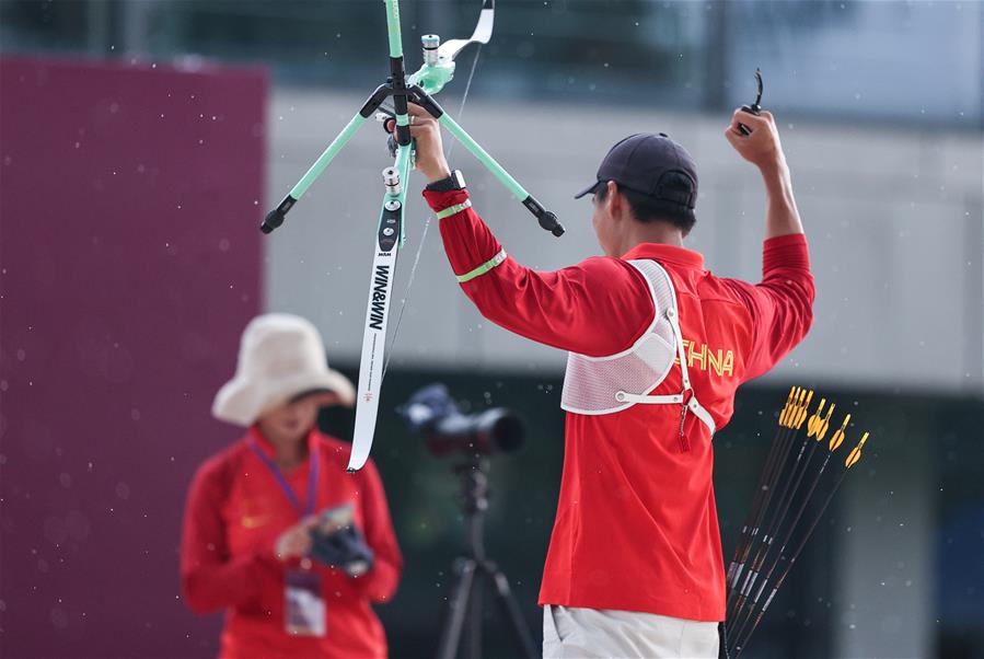 7月7日,国家一队选手戴小祥在比赛中庆贺胜利。 当日,在位于南京的江苏省方山体育训练基地举行的射箭项目东京奥运会模拟赛男子反曲弓个人比赛中,国家一队选手戴小祥获得第一名。 新华社记者杨磊摄