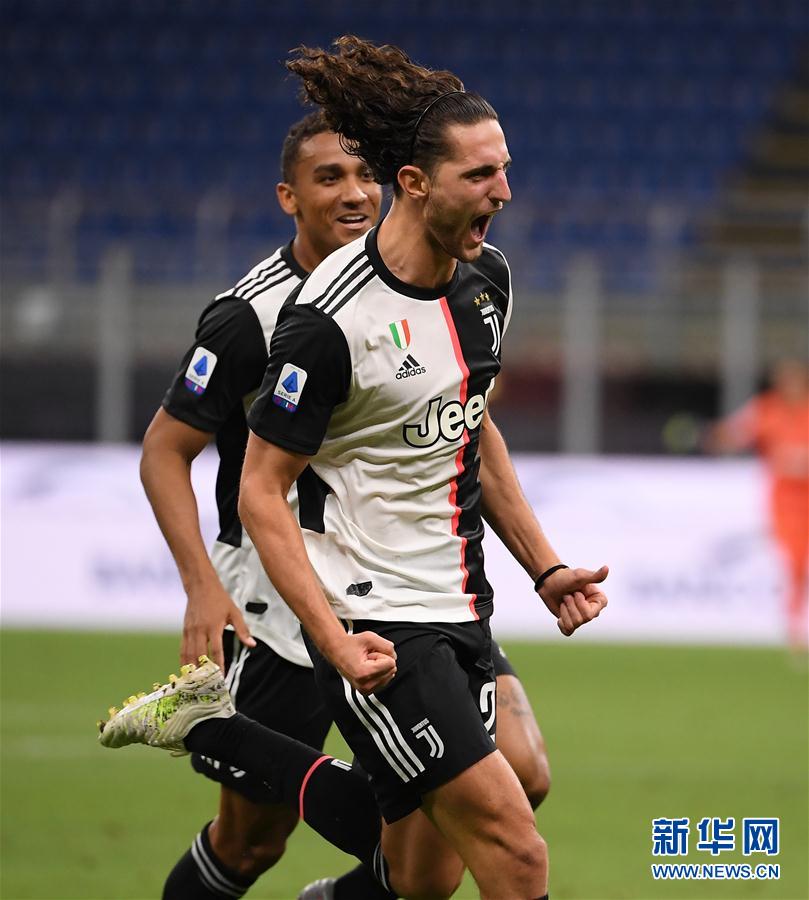 7月7日,尤文图斯队球员拉比奥(右)进球后庆祝。 当日,在2019-2020赛季意大利足球甲级联赛第31轮比赛中,AC米兰队主场以4比2战胜尤文图斯队。 新华社发(阿尔贝托·林格利亚摄)