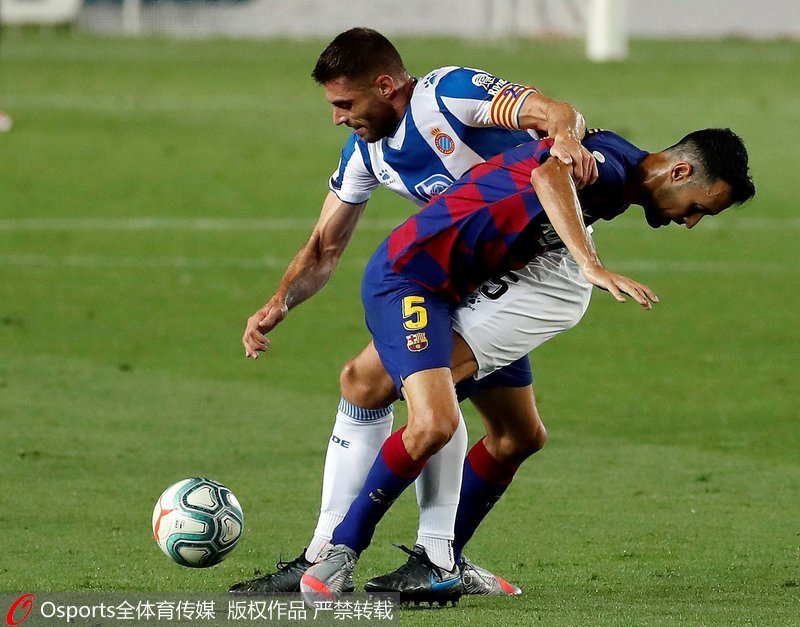 第10分钟,西班牙人中场长传,恩巴尔巴禁区右侧反越位小角度右脚推射,特尔施特根伸腿将球挡出。