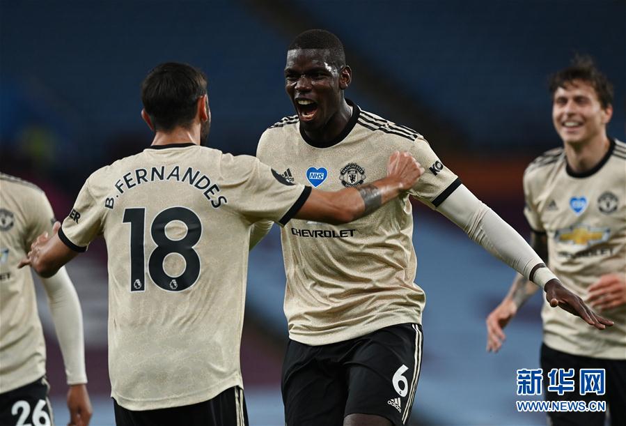 7月9日,曼彻斯特联队球员博格巴(中)进球后与队友庆祝。 当日,在2019-2020赛季英格兰足球超级联赛第34轮比赛中,曼彻斯特联队客场以3比0战胜阿斯顿维拉队。 新华社/路透
