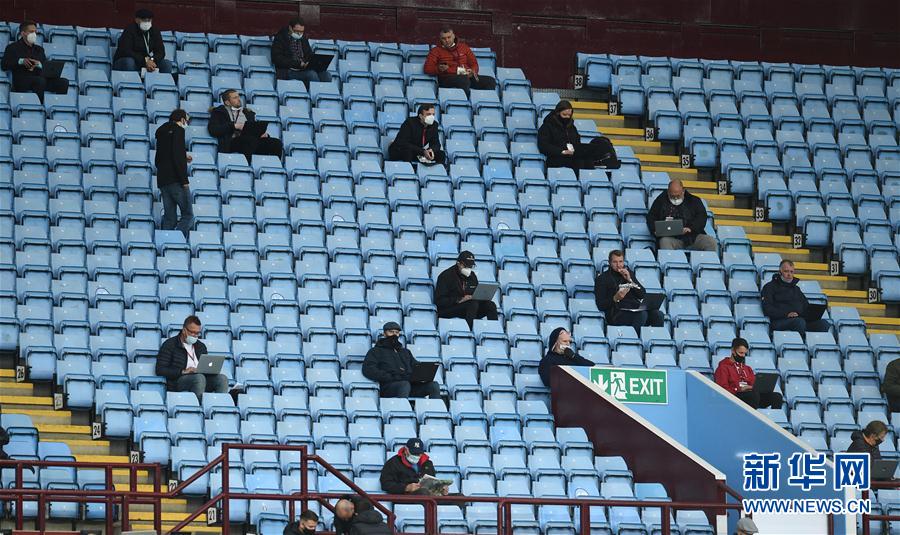 7月9日,记者在观众席工作时保持社交距离。 当日,在2019-2020赛季英格兰足球超级联赛第34轮比赛中,曼彻斯特联队客场以3比0战胜阿斯顿维拉队。 新华社/路透