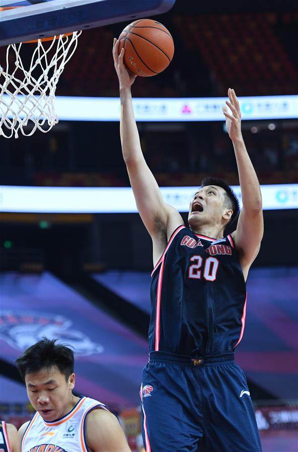 7月10日,广东东莞银行队球员任骏飞(右)在比赛中投篮。 当日,在山东青岛举行的2019-2020赛季中国男子篮球职业联赛(CBA)复赛第二阶段(红岛赛区)比赛中,广东东莞银行队以122比89战胜上海久事队。 新华社记者朱峥摄