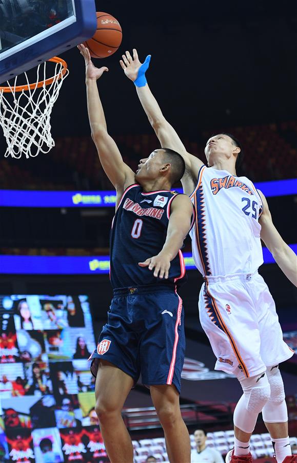 7月10日,广东东莞银行队球员刘权标(左)在比赛中投篮。 当日,在山东青岛举行的2019-2020赛季中国男子篮球职业联赛(CBA)复赛第二阶段(红岛赛区)比赛中,广东东莞银行队以122比89战胜上海久事队。 新华社记者朱峥摄
